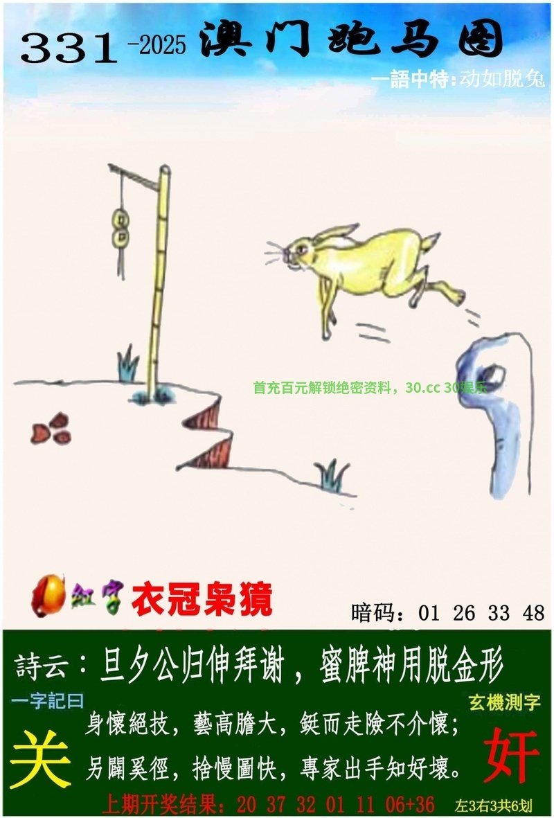 331期一字記曰:【关】身怀绝技,艺高胆大,铤而走险不介怀。另辟奚径,捨慢图快,专家出手知好坏。《奸》 |